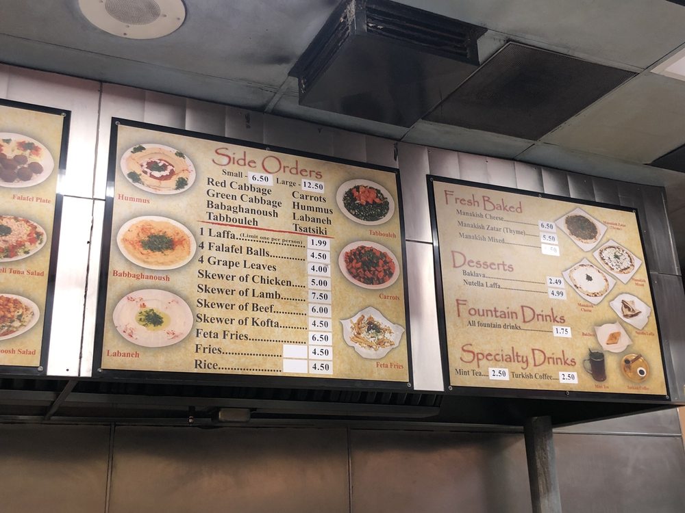 Inside: hummus, lettuce, tomato, onion, tahina, hot sauce, rice or fries inside